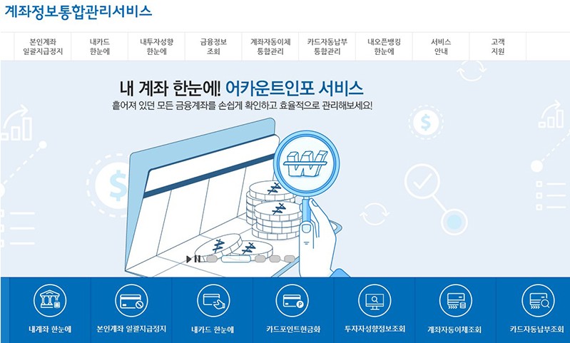 어카운트인포(계좌정보통합관리서비스)는 미청구 퇴직연금 조회 이외에도 자신의 계좌 조회, 보험·대출·투자성향 등 금융정보, 자동이체, 카드 및 포인트 등 다양한 서비스를 제공하고 있습니다.