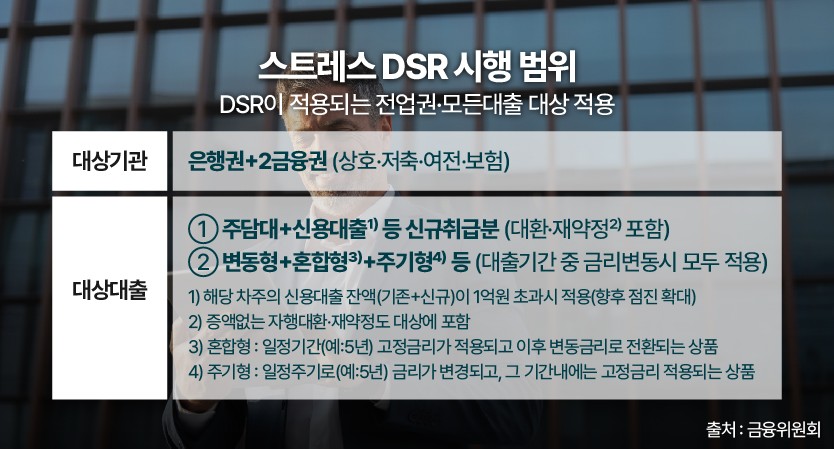 스트레스 DSR의 시행 범위는 DSR이 적용되는 모든 대출을 대상으로 적용됩니다.
