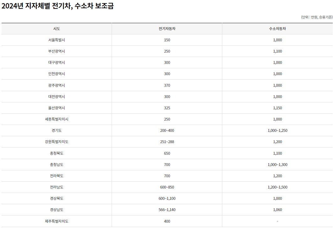 올해 24년도 국고보조금과 지자체 보조금 지원이 확정된 전기승용 및 초소형 전기자동차, 전기화물차, 전기승합차, 전기이륜차, 건설기계 및 수소차등 보조금 지원 대상 차종의 확인은 하기 링크를 통하여 제조사/수입사, 차종 및 국고보조금 지원 금액과 각 시도별 지자체 보고금 지원 금액까지 정확하게 확인할 수 있으니 구매 전 확인하여 내가 사고자 하는 차량의 보조금 지원 유무를 반드시 알아보신 후 구매하시기를 추천드립니다.