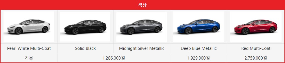 모델 3은 흰색 계통인 Pearl White Multi-Coat를 기본으로 추가 비용이 들어가는 4가지 색상을 지원하고 있습니다.